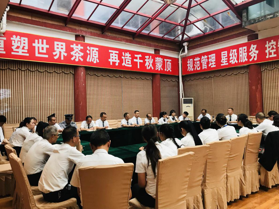 2019年9月10日下午,蒙顶山旅游公司总经理卫建勇在茶源堂主持召开主管及以上人员参加的8月份经营情况分析会。会上传达学习《四川省文化和旅游厅关于2019年全省A级景区复核检查结果的通报》。各中心主任汇报了8月工作中存在的问题及下一步的措施,总经理卫建勇对各部门工作总结进行点评并对8月份经营管理、安全工作情况进行了分析总结。安排部署了“中秋小长假”“国庆黄金周” 景区接待服务和安全保障工作。