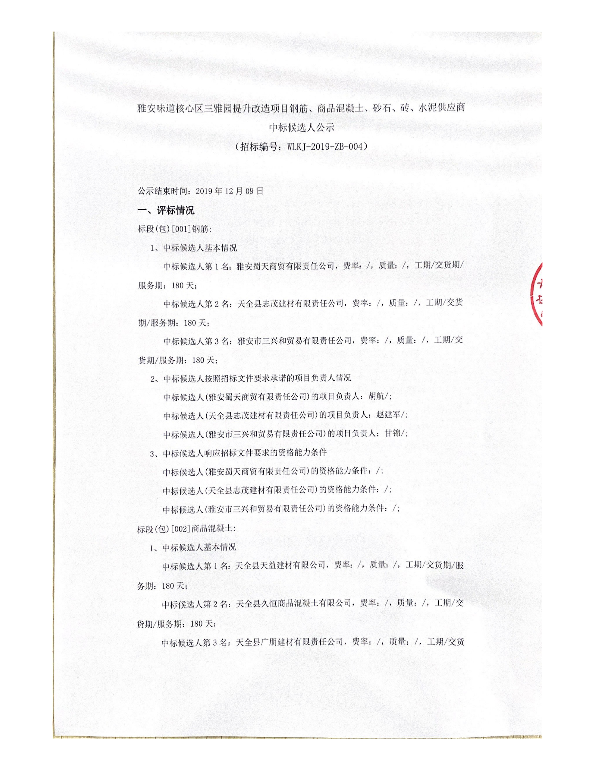 雅安味道核心区三雅园提升改造项目钢筋、商品混凝土、砂石、砖、水泥供应商中标候选人公示
