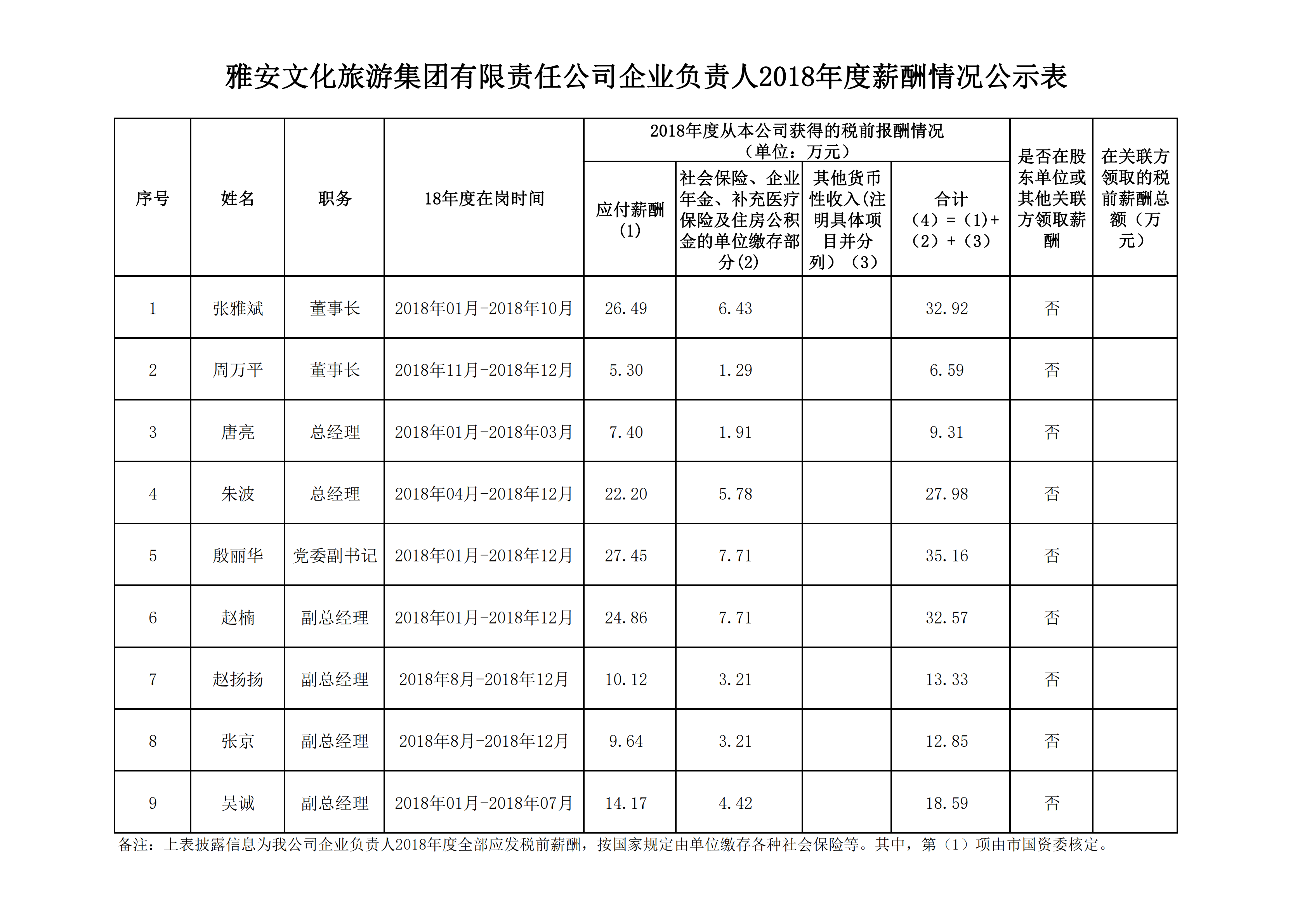 雅安文化旅游集团有限责任公司企业负责人2018年度薪酬情况公示表