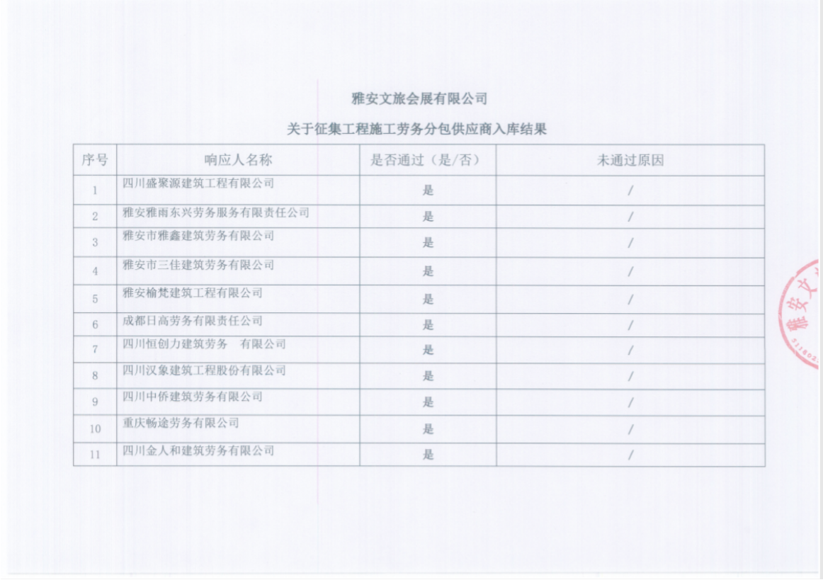 雅安文旅会展有限公司关于征集工程施工劳务分包供应商入库结果公示