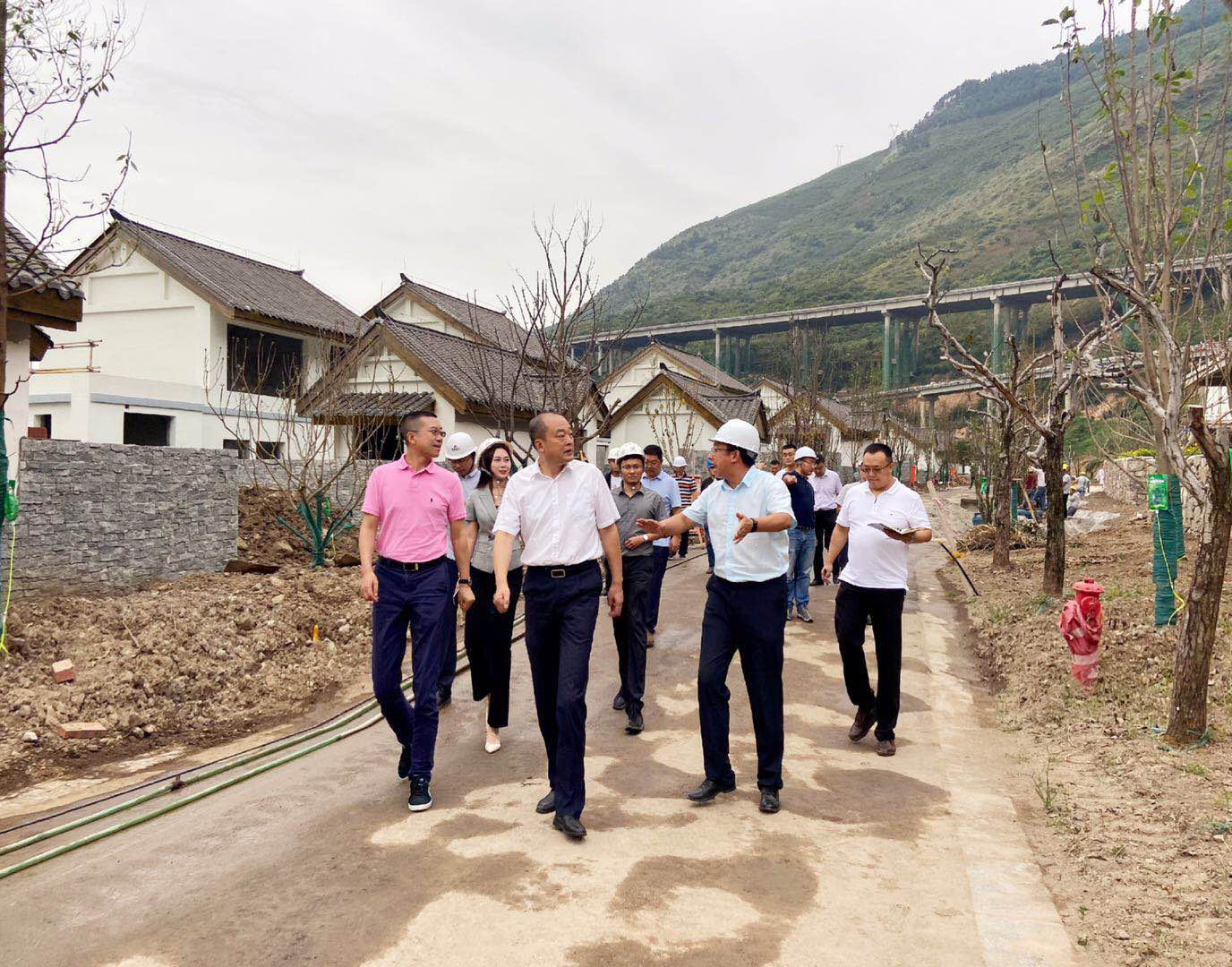 兰开驰书记在梨乡山居项目现场查看了度假酒店建设进度,看到现场管理规范、秩序井然,工程建设者正抢抓晴好天气有利时节,全力推进施工进度,兰开驰书记非常高兴。