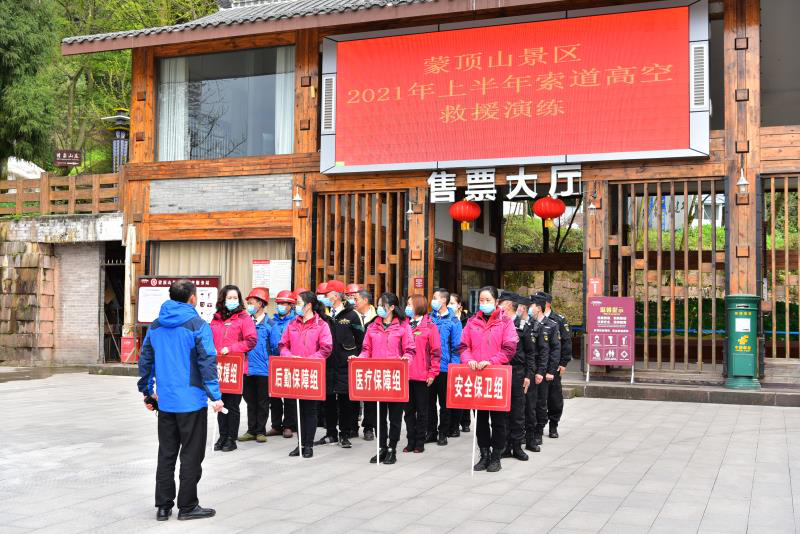2021年3月22日,蒙顶山景区为迎接旺季工作到来,深入开展特种设备三年整治行动攻坚工作,坚持习近平总书记“人民至上、生命至上”的要求,组织索道高空救援演练和滑索应急救援演练。雅安市市场监督局、名山区市场监督局、名山区文化体育和旅游局相关领导莅临现场观摩指导。