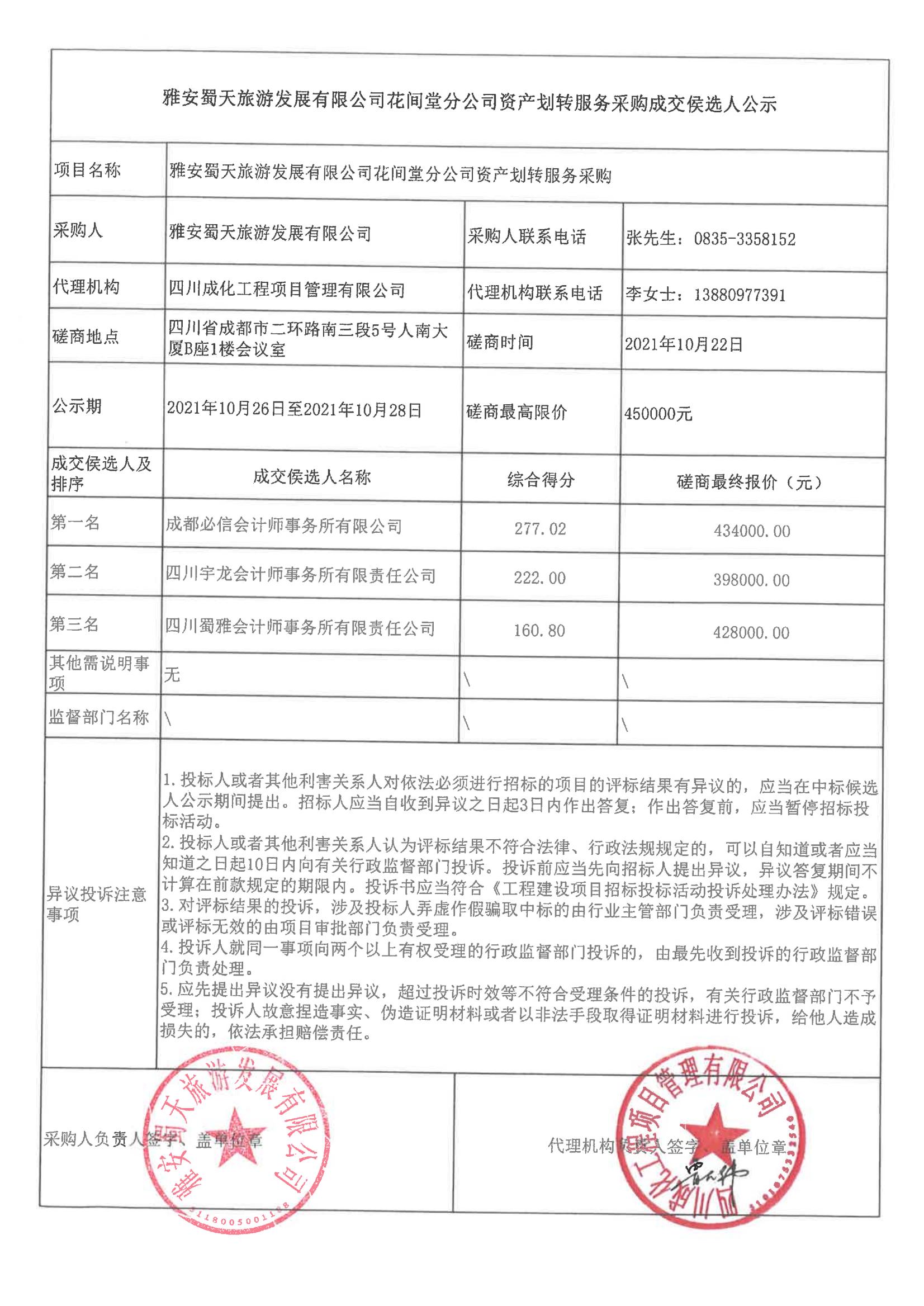 雅安蜀天旅游发展有限公司花间堂分公司资产划转服务采购成交候选人公示