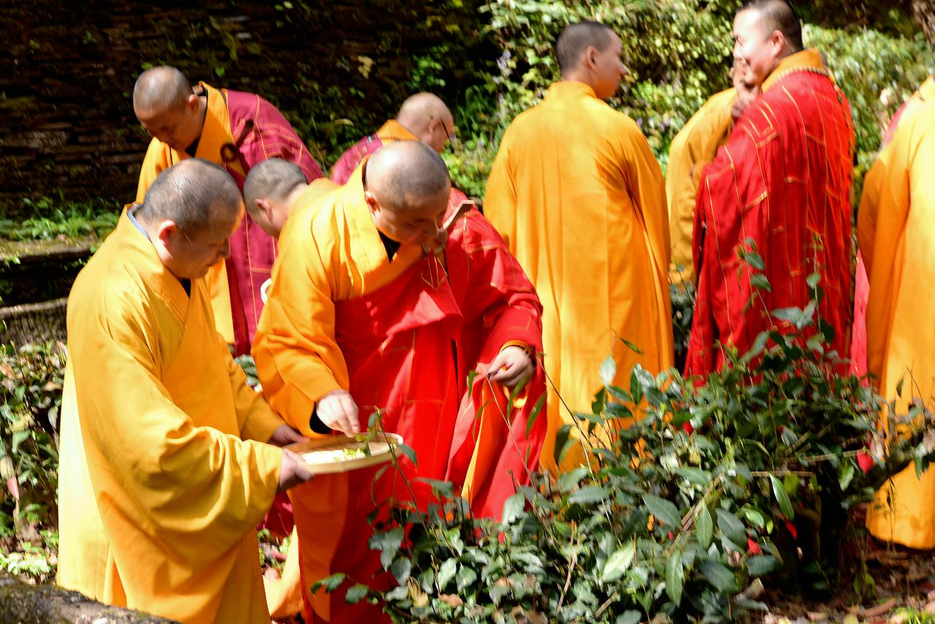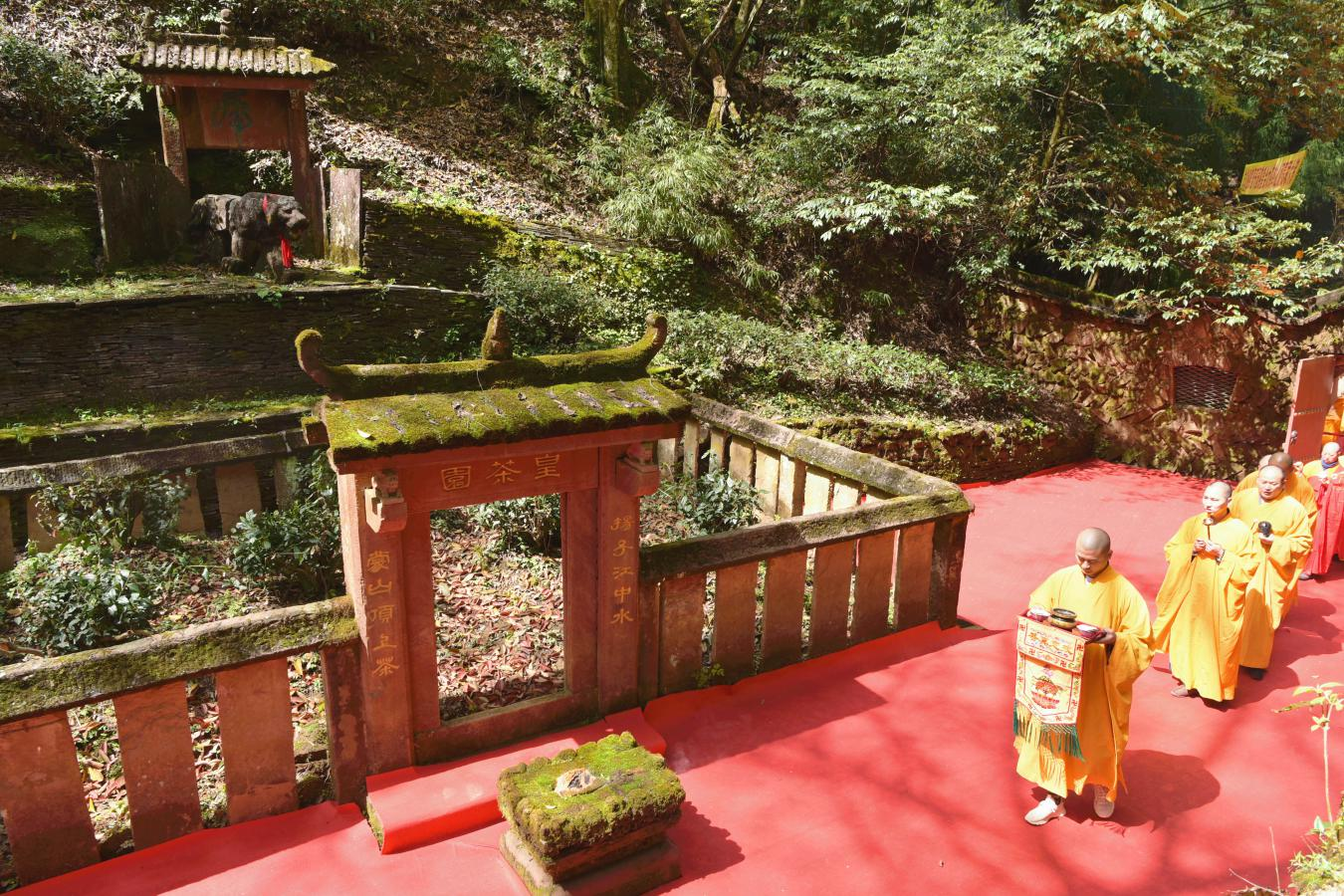 开园仪式上,在蒙顶五峰之心——皇茶园,由众僧人洒净、焚香、礼拜,然后入园采茶,再现了蒙顶山茶作为皇室贡品敬天祭祖的文化传承和历史辉煌。