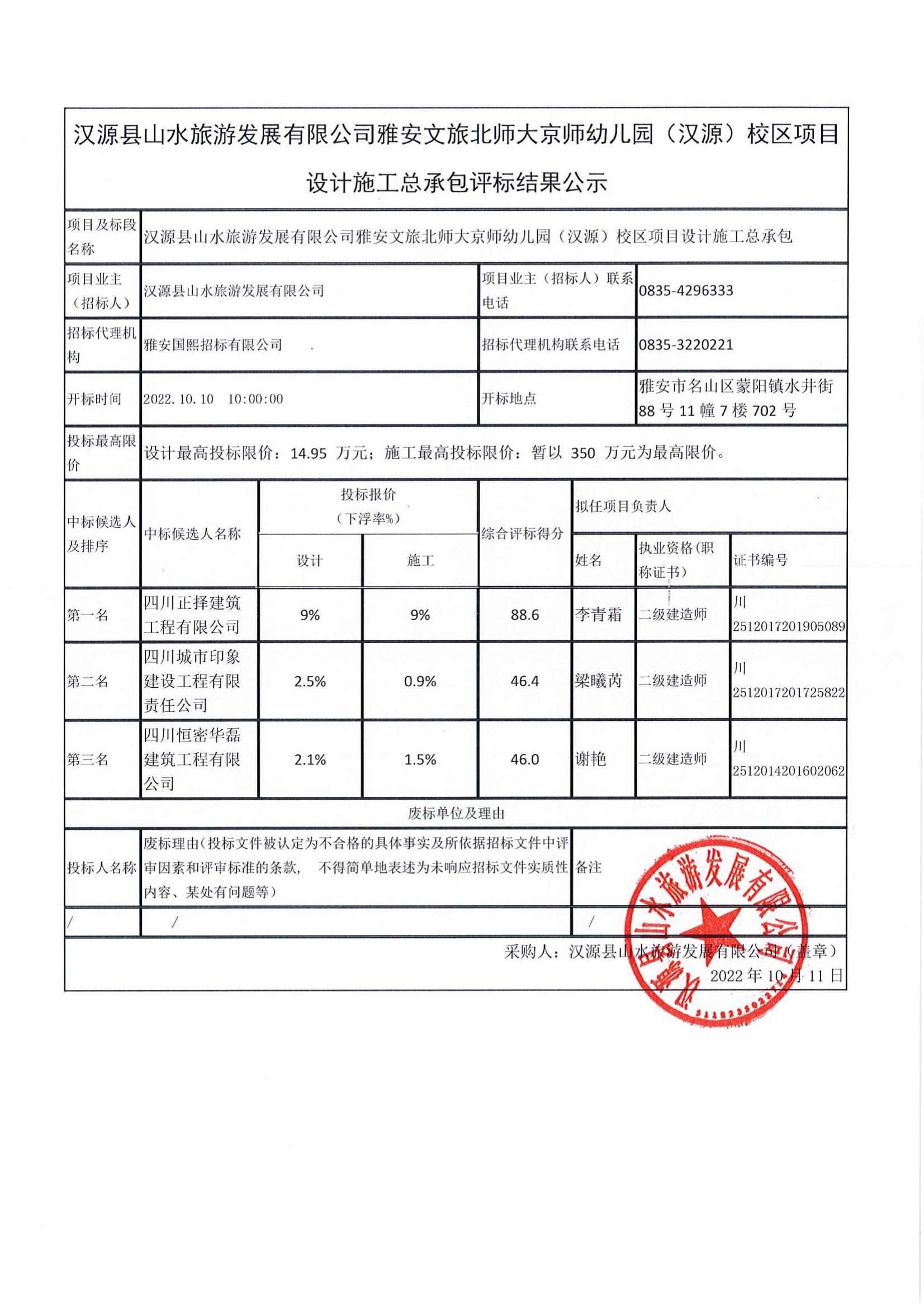 汉源县山水旅游发展有限公司雅安文旅北师大京师幼儿园(汉源)校区项目设计施工总承包评标结果公示
