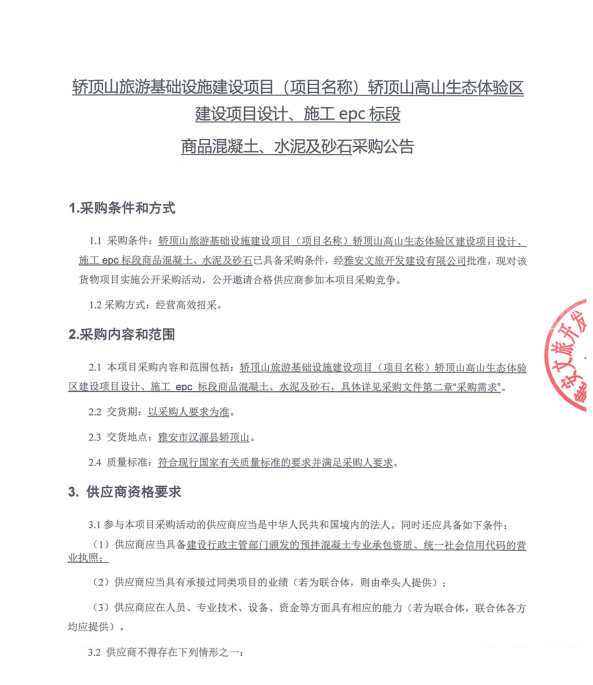轿顶山旅游基础设施建设项目 (项目名称)轿顶山高山生态体验区建设项目设计、施工epc标段商品混凝土、水泥及砂石采购公告