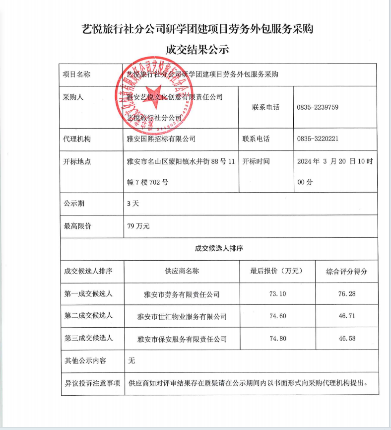 艺悦旅行社分公司研学团建项目劳务外包服务采购成交结果公示