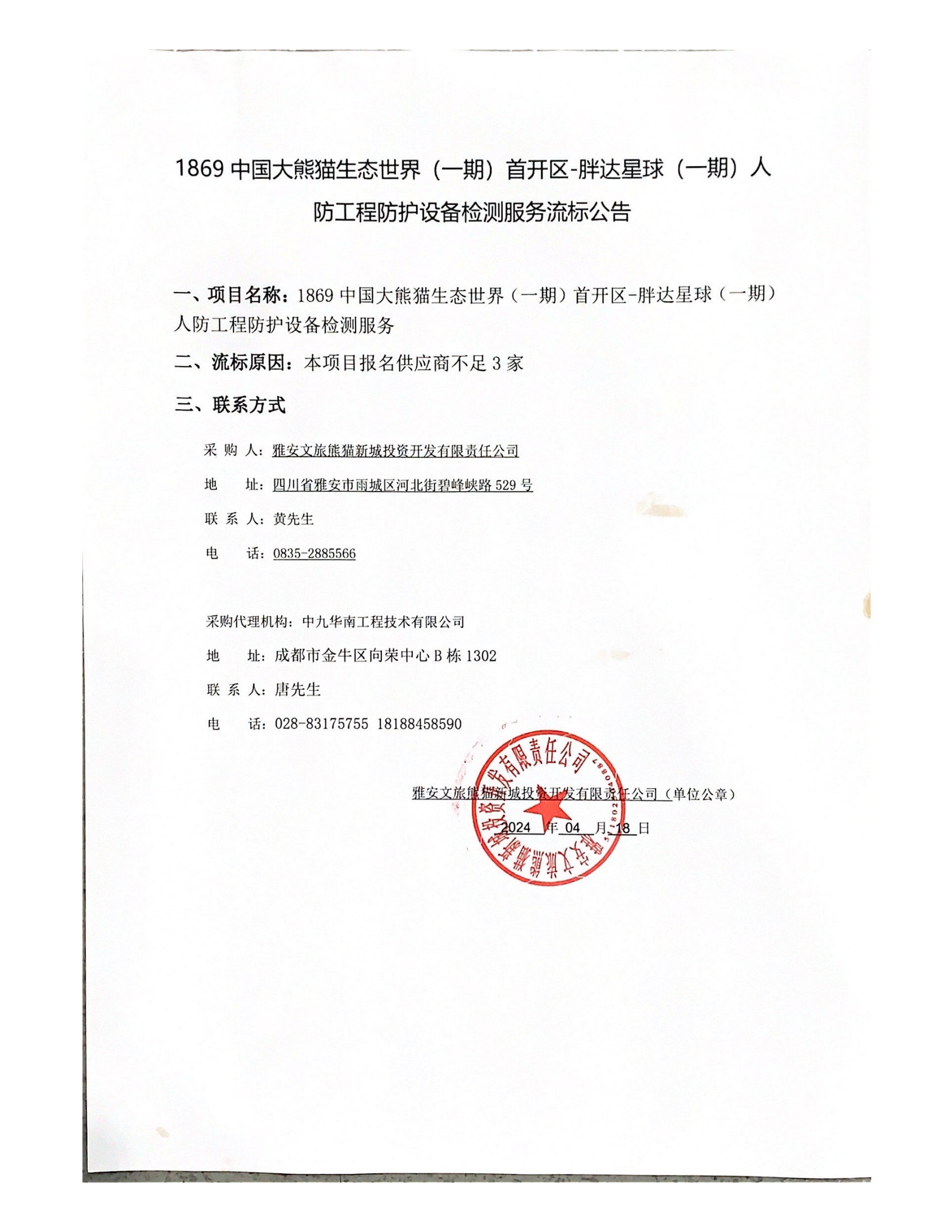 1869 中国大熊猫生态世界 (一期) 首开区-胖达星球 (一期)人防工程防护设备检测服务流标公告