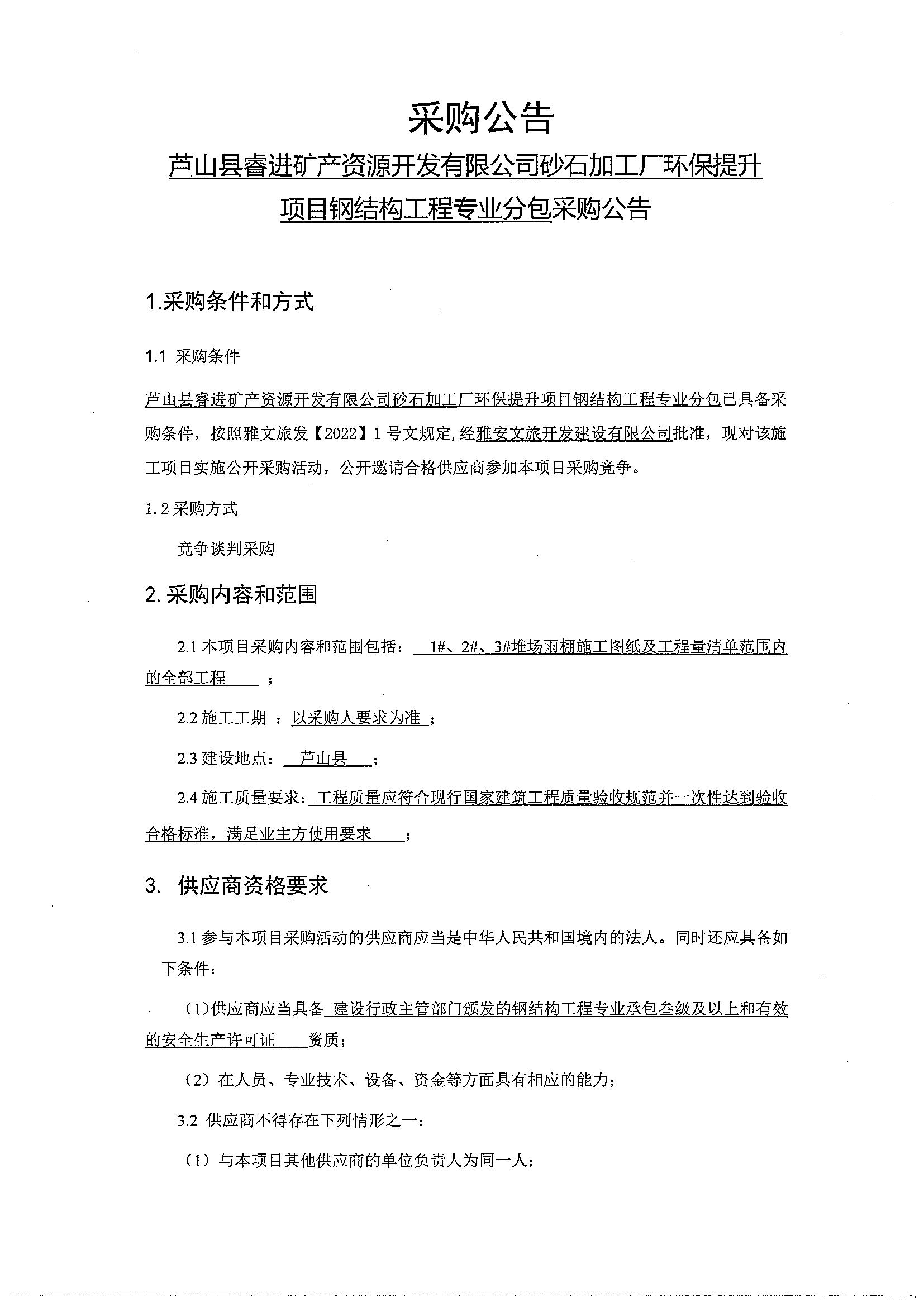 芦山县睿进矿产资源开发有限公司砂石加工厂环保提升 项目钢结构工程专业分包采购公告