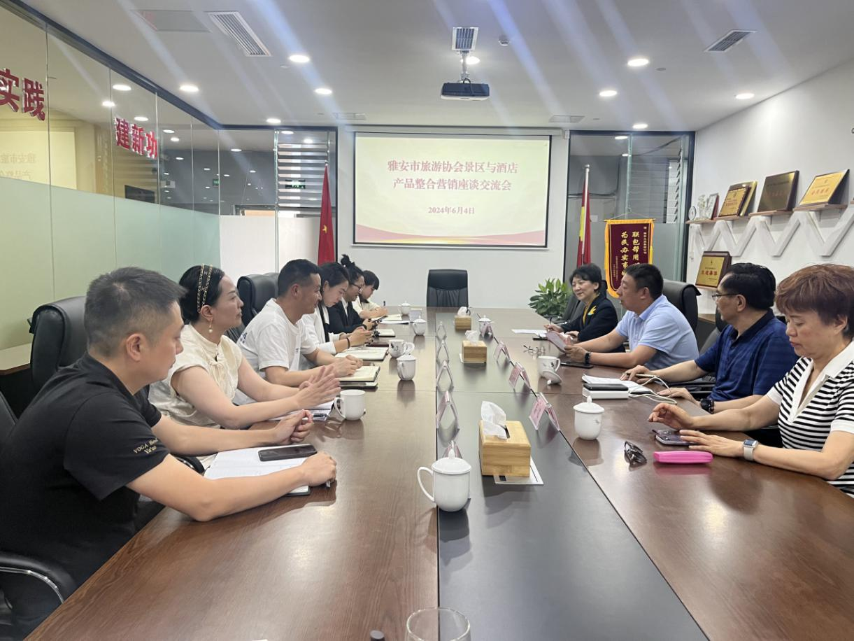 为有效整合旅游资源,充分拉动旅游消费内需,拓宽客源市场,增强来雅游客的一站式体验, 6月4日下午,雅安市旅游协会组织部分景区、酒店代表进行座谈交流,聚焦资源整合,联合营销,为合作共赢找寻契合点。雅安市旅游协会会长、有爱爱党委书记、董事长肖永昌,雅安市旅游协会副会长、秘书长李涯冰,副会长胡运、高凌以及碧峰峡、蒙顶山、王岗坪景区、皇冠假日酒店、希尔顿逸林酒店、西网国际酒店、西康大酒店、丽雅查尔顿酒店等负责人参加座谈。