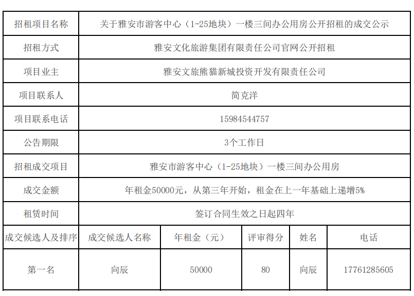 关于雅安市游客中心(1-25地块)一楼三间办公用房公开招租的成交公示